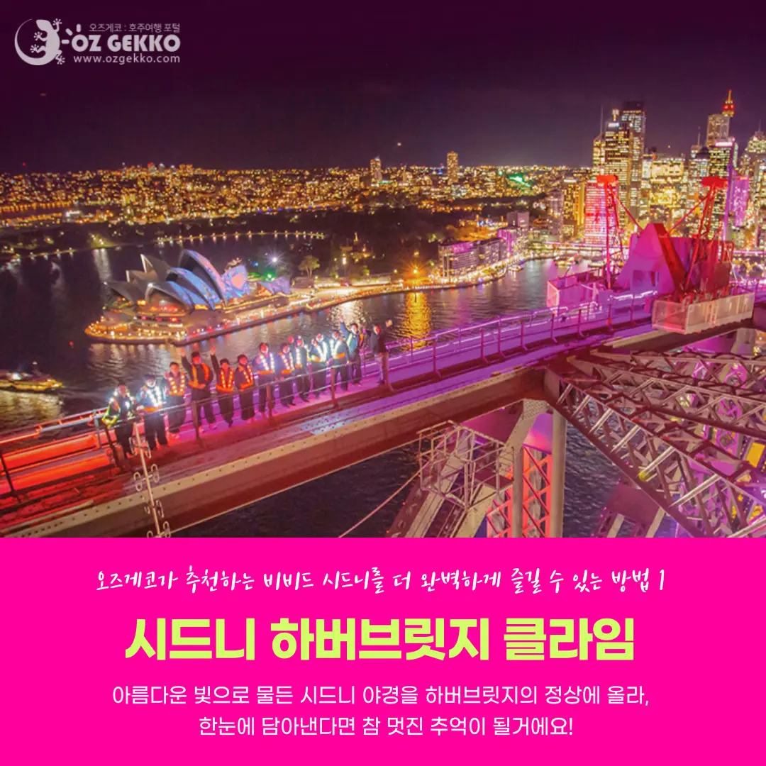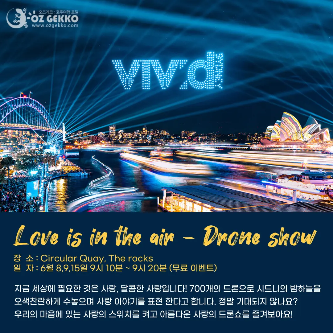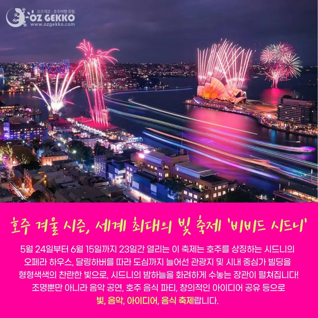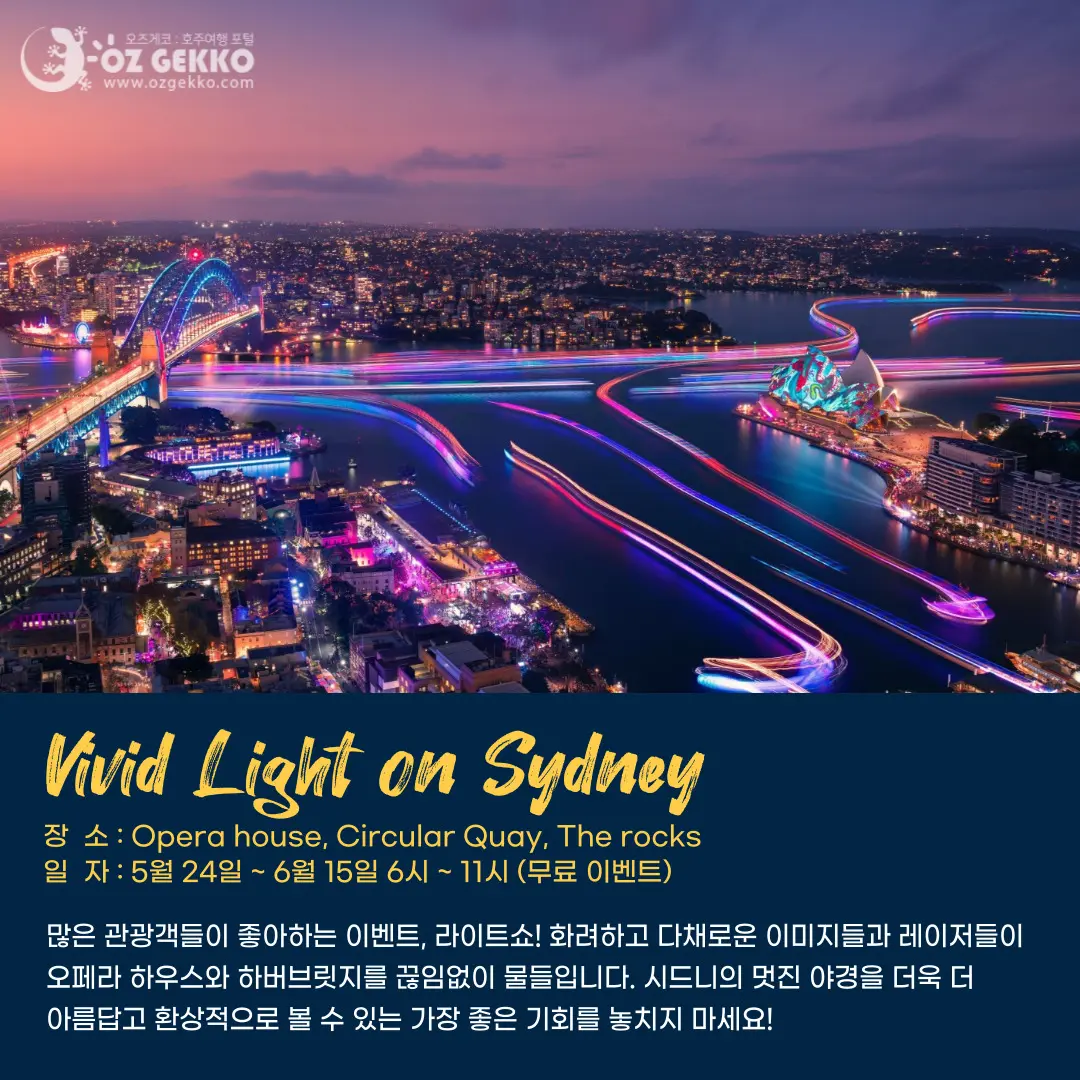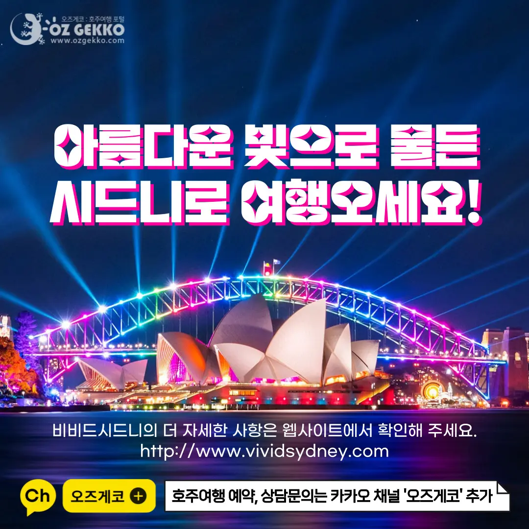 호주 겨울 시즌에 세계 최대의 빛 축제로 진행되는 비비드 시드니는 호주를 상징하는 시드니의 오페라 하우스, 달링하버를 따라 도심까지 늘어선 관광지 및 시내 중심과 빌딩들을 형형색색의 찬란한 빛으로 시드니의 밤하늘을 화려하게 수놓는 장관이 펼쳐집니다!