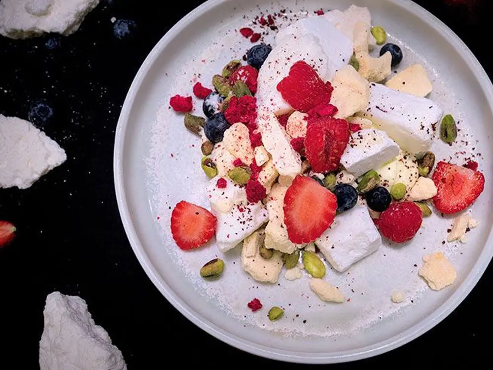 티라미수, 초콜릿 쉐이빙, 계절성 베리 또는 데친 배, 사프란, 스타아니스, 마스카포네, 허니 크럼블