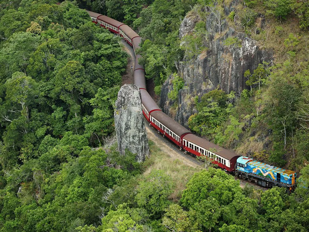 그림같이 아름다운 기차역에서 기차를 타고 크리크 폭포와 케언즈의 드라마틱한 풍경을 감상하거나